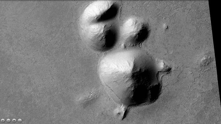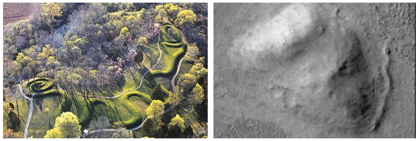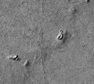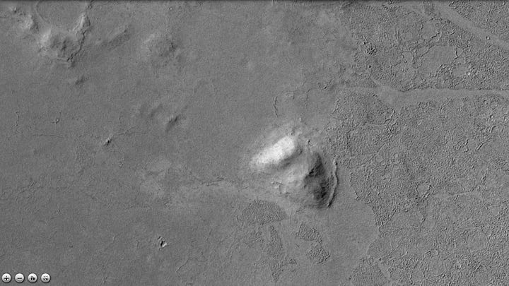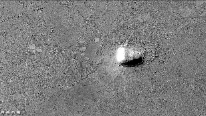 Without a careful search, some of the most intriguing features of this area would go unnoticed. They would not actually be small were we standing in front of them, but compared to the massive structures, they basically disappear into the landscape. They add very important compounding evidence for artificiality.
