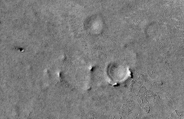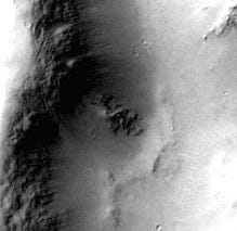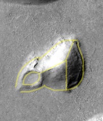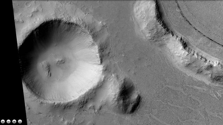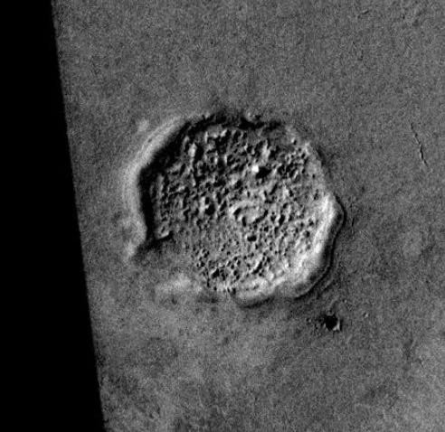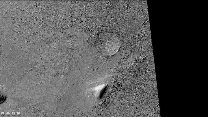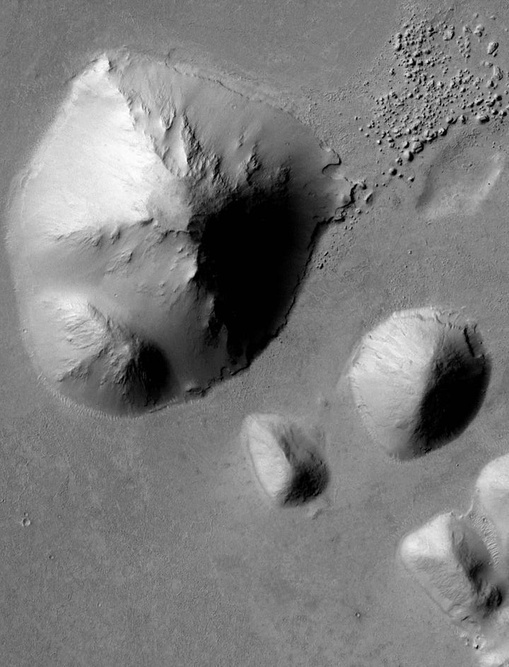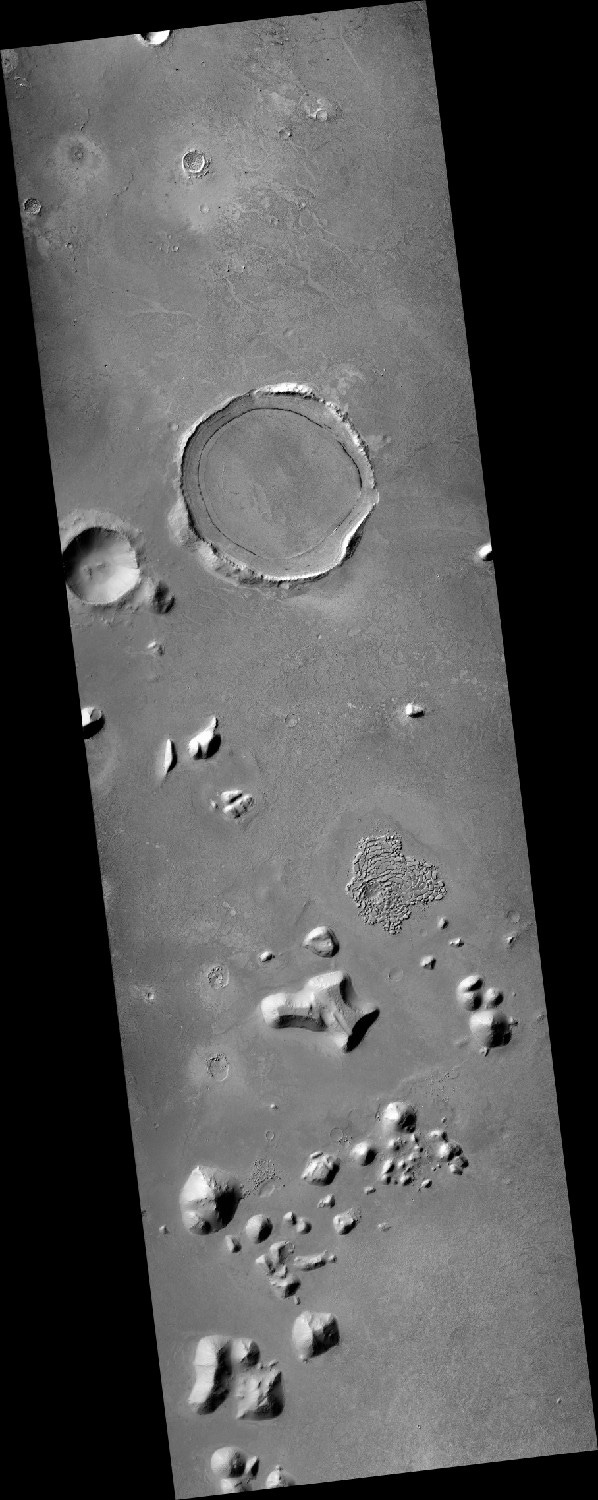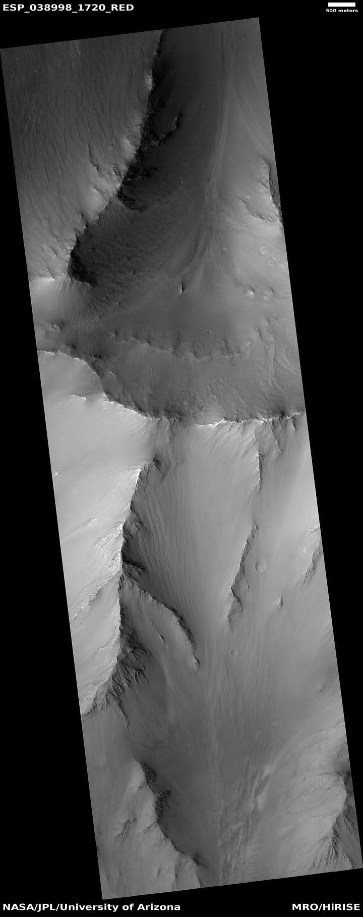 The two craters (or perhaps mounds) below are interesting but difficult to interpret. They’re quite a distance apart from each other, and don’t have the features of a meteor strike. There is at least one symmetrical opening along the outer ridges. The texture inside the craters doesn’t match any texture in the rest of the landscape, nor does it match impact breccia uplifts that appear in complex craters. I certainly have a lot of questions about their unique features, but at this point I’m on the fence about how they were created or why their features are so different.