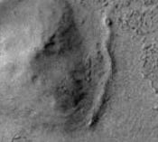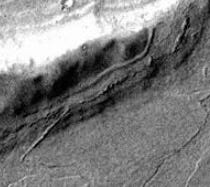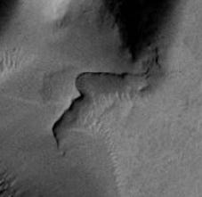 I call it a wall not just because of appearance, but its archaeological context. It’s stretched between two large structures at the outermost point where the structures meet the wild. If we accept these structures as artificial buildings, this is exactly the location where a boundary wall would be built. The darker wall stands out starkly against the lighter erosion material, clearly made of different material. We can see from the albedo (reflection) that erosion material is piling up against the inner wall but hasn’t yet piled so high as to cover it. On the outer edge, material blown up against the outside of the wall is darkened by the sharp overhanging shadows of the wall itself. The visible parts of the wall more or less maintain uniform width for roughly 660 meters. There are no other features in the landscape that resemble it.