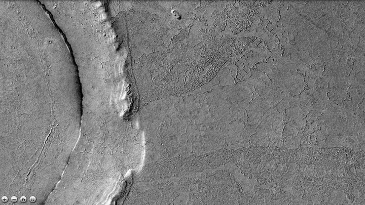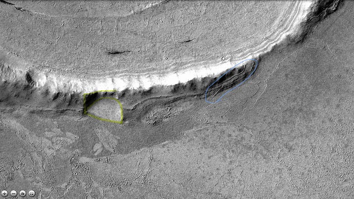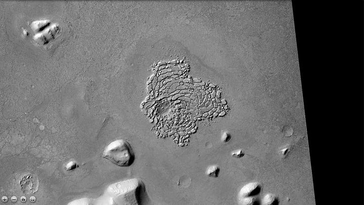 Elysium Planitia is a broad plain near the equator of Mars with the most recorded seismic activity, the most recent signs of volcanic activity, and signs of multiple water floods in the past. NASA has mapped ash-covered water ice in the area, similar in size to the North Sea, likely the remains of said flood waters. The area of the photo is part of a smaller region within Elysium called Cerberus Palus— “Palus” meaning “swamp”— which at one point contained a lake fed by the Athabasca Valles outflow channel system. Recall that all major First Civilizations on Earth began in similar river valleys.