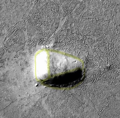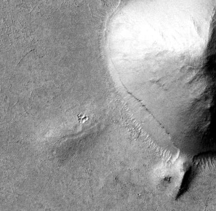 Nearly every structure in this photo has anomalous features. The geometry of the area doesn’t resemble any mountain ranges on Earth or Mars. Earth’s mountain ranges are largely the result of tectonic plates smashing into one another, but Mars doesn’t have tectonic plates. Scientists aren’t sure yet how non-volcanic Martian mountains are even made, but the working theory is that they aren’t so much tectonic “mountains” as masses of sedimentary stone that have been eroded by wind and climate change into shapes resembling mountain ranges. (A lack of plate tectonics also contributes to the survival of surface material.)
